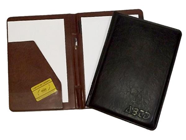 Pasta convenção tamanho 51x34 aberto e 25x34 fechado, em couro sintético, com acabamento em costura e cantos arredondados, com gravação logomarca em baixo relevo com espaço para bloco de anotações, folhas soltas, caneta e cartão.